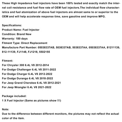 1PCS Fuel Injector 05038337AB Fit Dodge Charger Fit Grand Cherokee 2012-2021