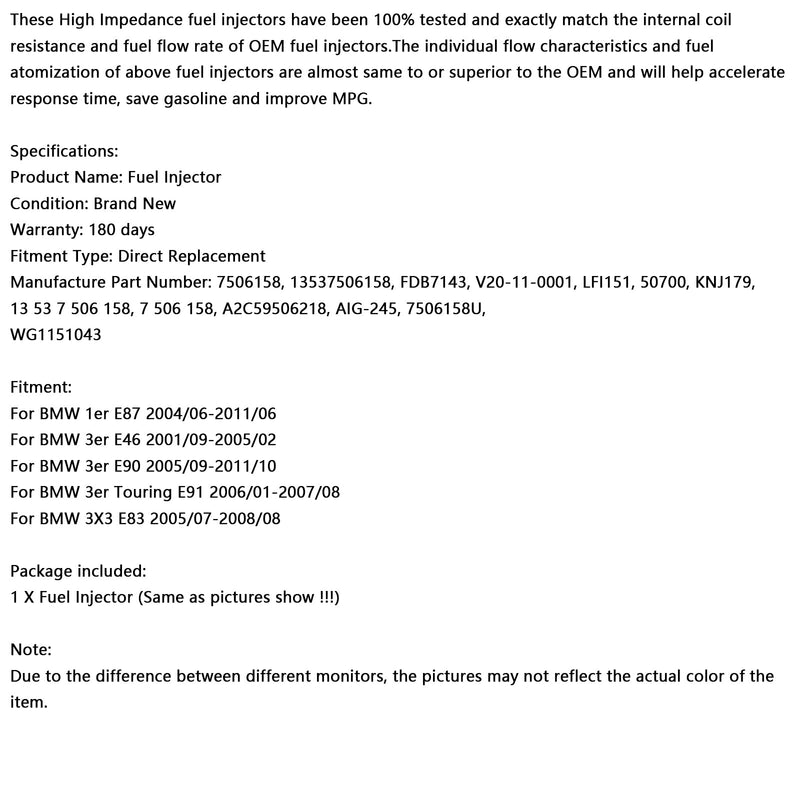 1PCS Fuel Injector 13537506158 Fit BMW 116i 120i 316i 318i 320i X3 Z4 7506158