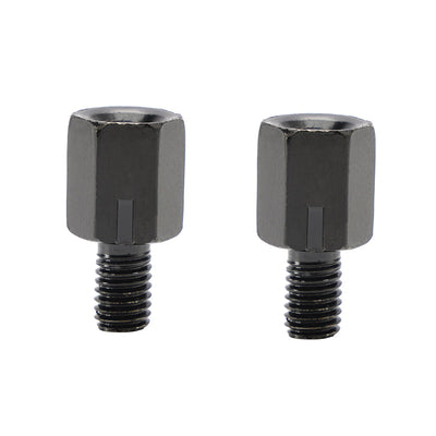 Pair of black metal motorcycle mirror adapters.