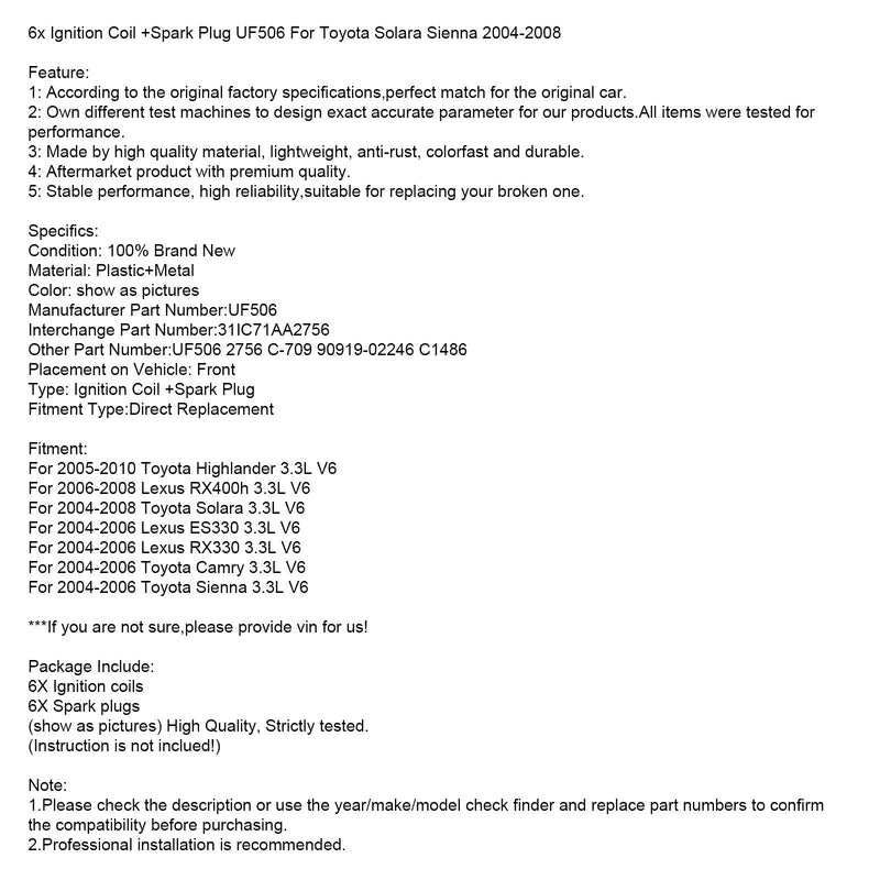 6x Ignition Coil +Spark Plug UF506 Fit For Toyota Solara Sienna 2004-2008 31IC71AA2756 UF506