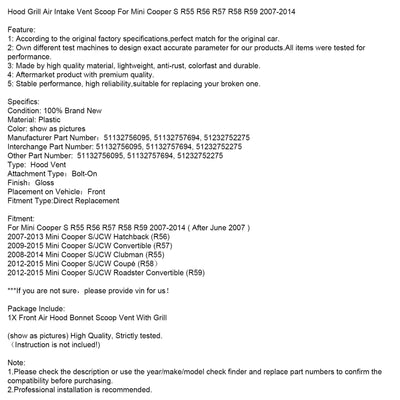 Hood Grill Air Intake Vent Scoop Fit For Mini Cooper S R55 R56 R57 R58 R59 2007-2014