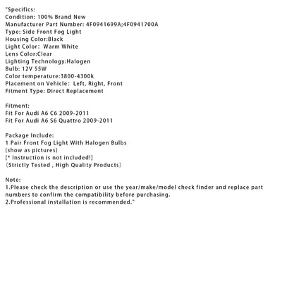 2009-2011 Audi A6 S6 Quattro Pair Front Bumper Driving Fog Light Lamps 4F0941699A
