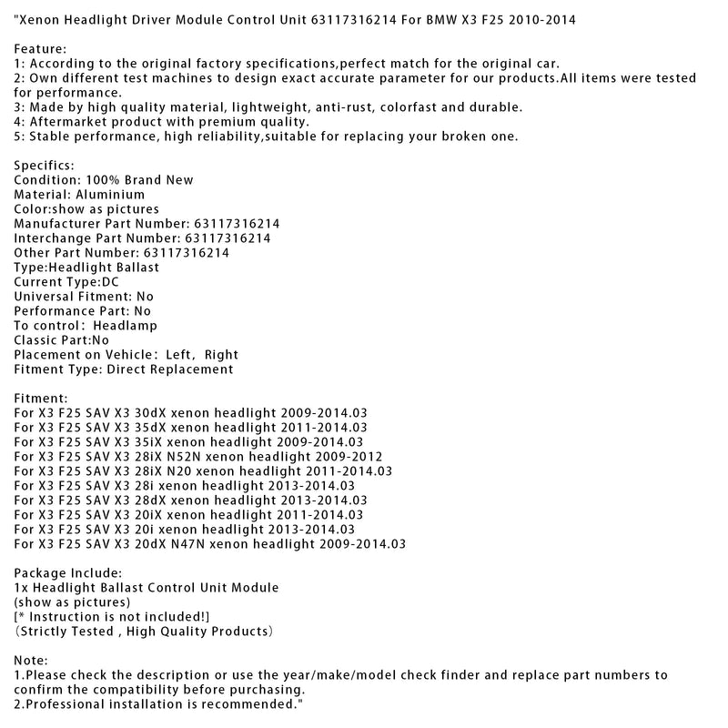 Xenon Headlight Driver Module Control Unit 63117316214 For BMW X3 F25 2010-2014