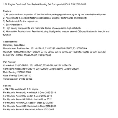 1.6L Engine Crankshaft Con Rods & Bearing Set Fit For Hyundai SOUL RIO 2012-2019