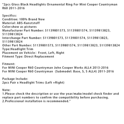2011-2016 MINI Cooper R60 Countryman (Submodel: Base, S, S ALL4) 2pcs Gloss Black Headlights Ornamental Ring