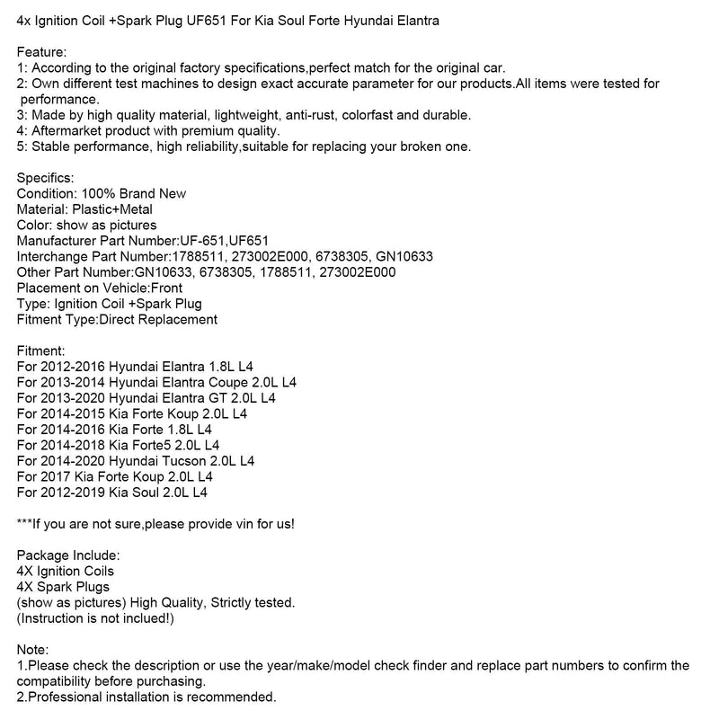 4x Ignition Coil +Spark Plug UF651 Fit For Kia Soul Forte Hyundai Elantra