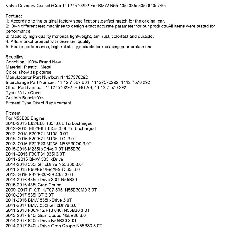 Valve Cover w/ Gasket+Cap 11127570292 For BMW N55 135i 335i 535i 640i 740i