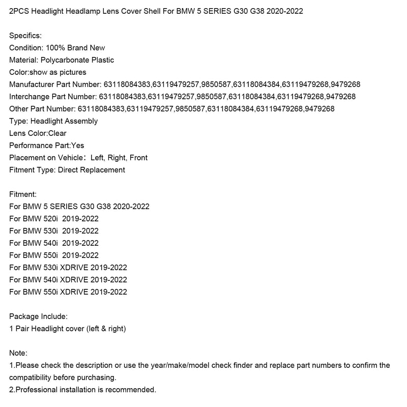2019-2022 BMW 530i XDRIVE 2PCS Headlight Headlamp Lens Cover Shell 63118084383