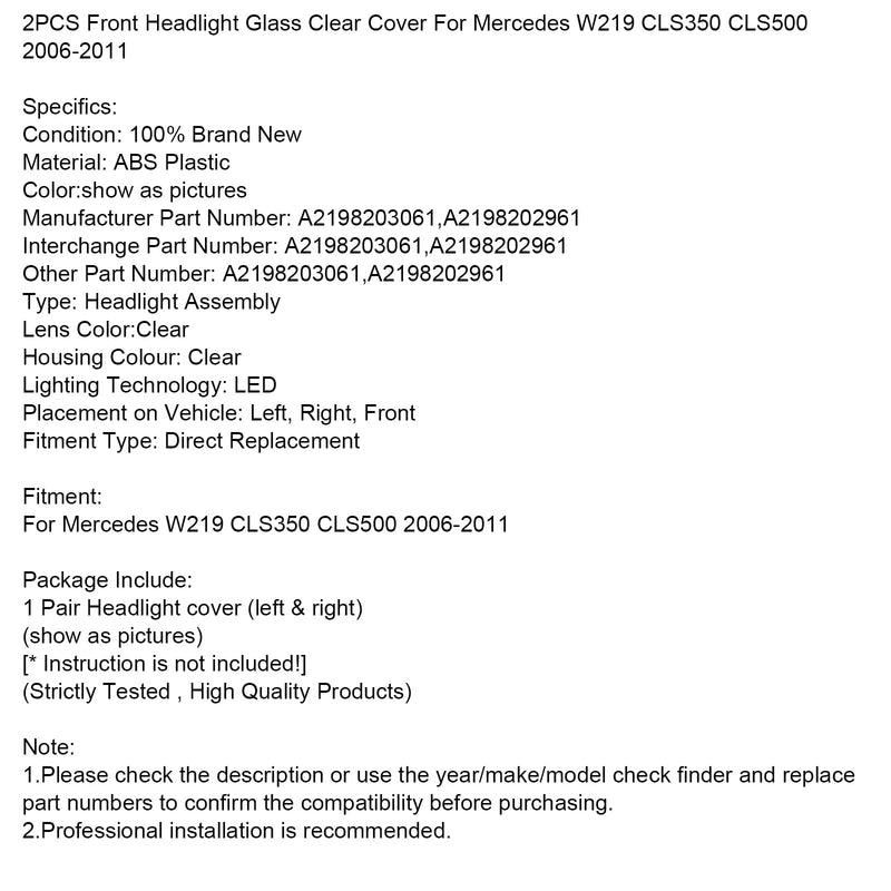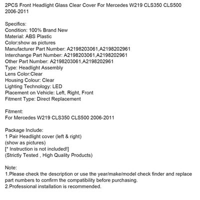 2PCS Front Headlight Glass Clear Cover For Mercedes W219 CLS350 CLS500 2006-2011