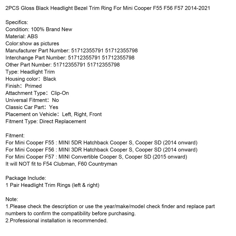 2PCS Gloss Black Headlight Bezel Trim Ring For Mini Cooper F55 F56 F57 2014-2021