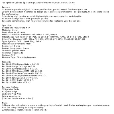 3x Ignition Coil+6x Spark Plug+3x Wire UF640 Fit For Jeep Liberty 3.7L V6