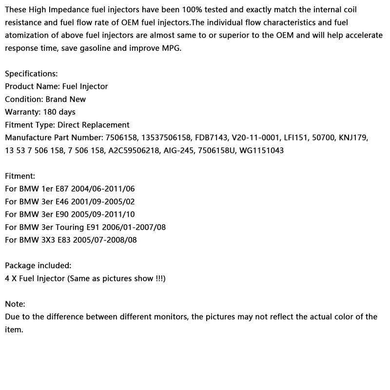 4PCS Fuel Injector 13537506158 Fit BMW 116i 120i 316i 318i 320i X3 Z4 7506158