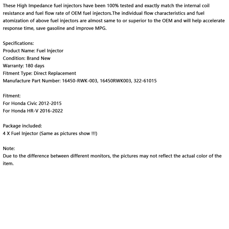 4PCS Fuel Injector 16450-RWK-003 Fit Honda HR-V 2016-2022 Fit Honda Civic