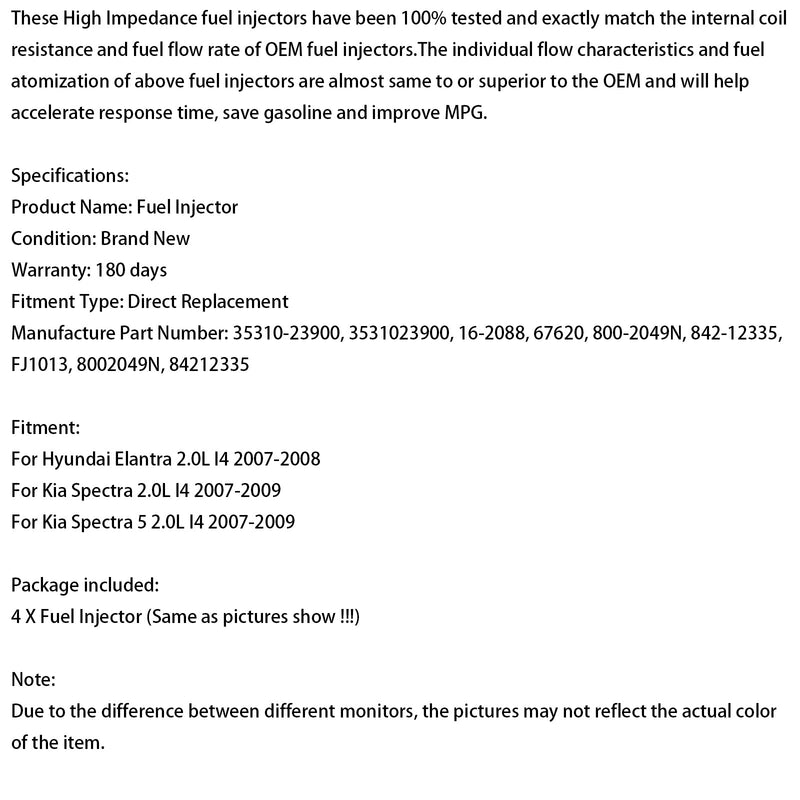 4PCS Fuel Injector 35310-23900 Fit Kia Spectra 2007-2009 Fit Elantra 2.0L