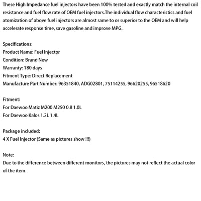4PCS Fuel Injector 96620255 Fit Chevrolet Fit Daewoo Matiz 0.8L 1.0L 96518620