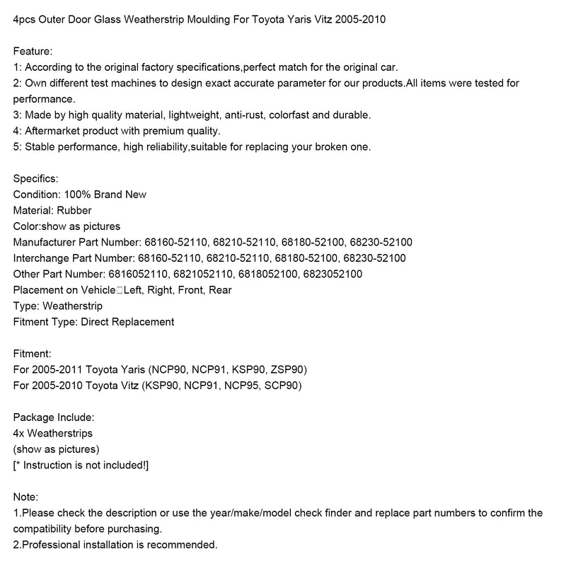 4pcs Outer Door Glass Weatherstrip Moulding For Toyota Yaris Vitz 2005-2010