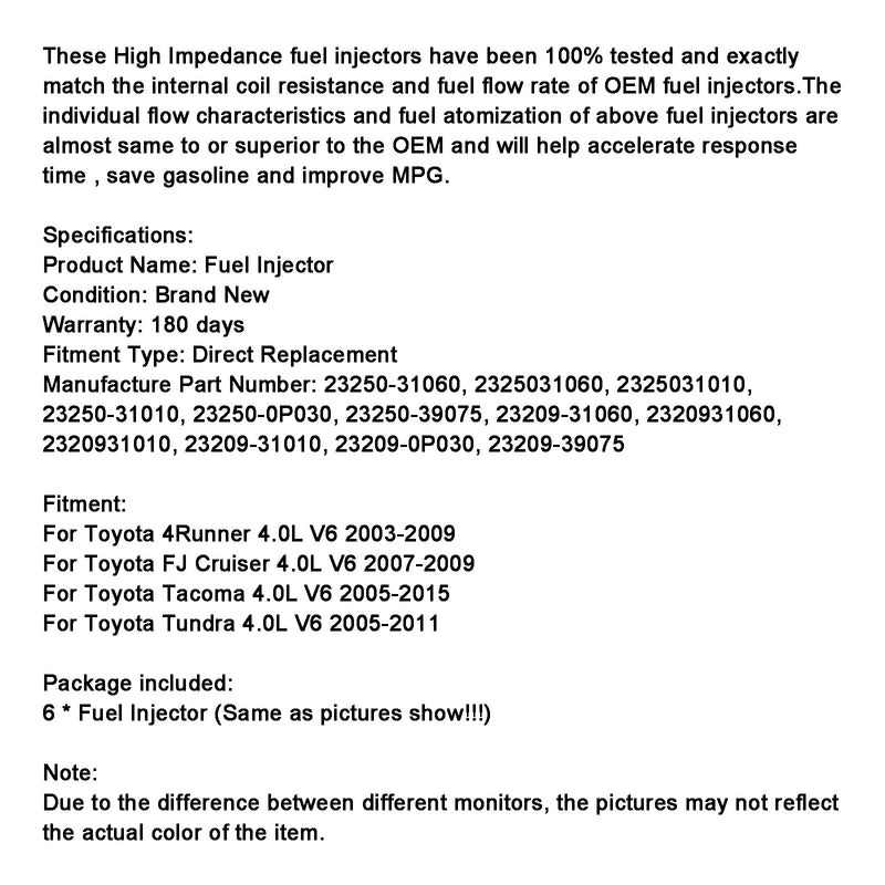 6PCS Fuel injector 23250-31060 Fit Toyota Tacoma 4Runner FJ Cruiser 23250-31010