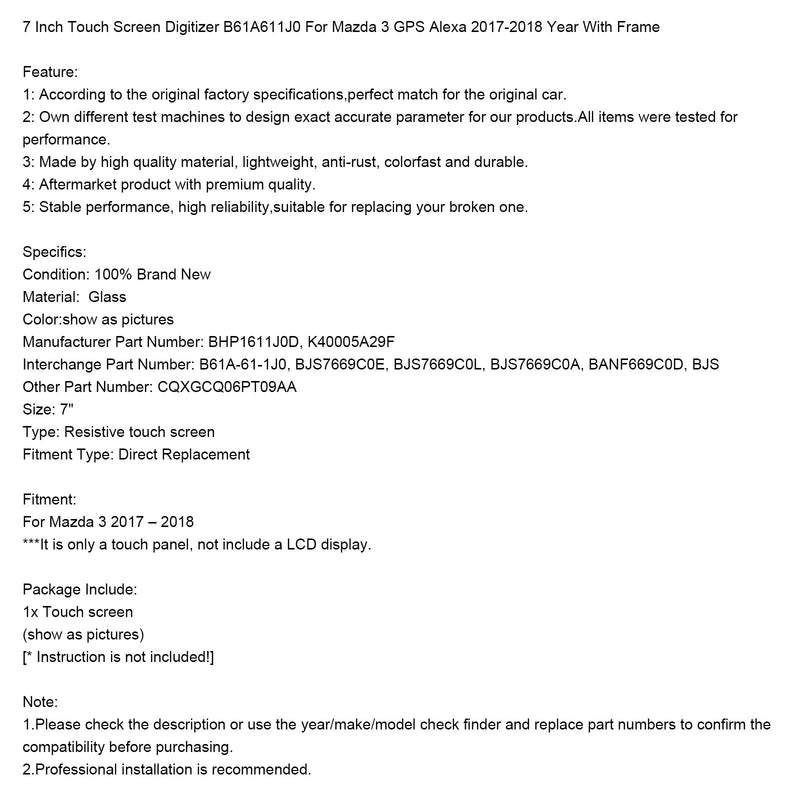 7 Inch Touch Screen Digitizer B61A611J0 For Mazda 3 GPS Alexa 2017-2018 Year With Frame