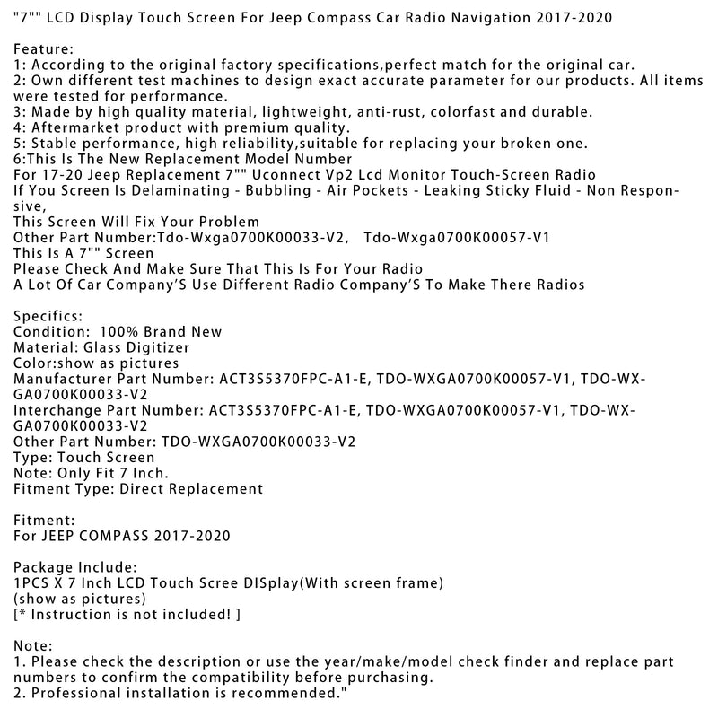 2017-2020 Jeep Compass Car Radio Navigation 7" LCD Display Touch Screen