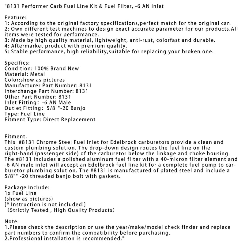 8131 Performer Carb Fuel Line Kit Fuel Filter -6 AN Inlet