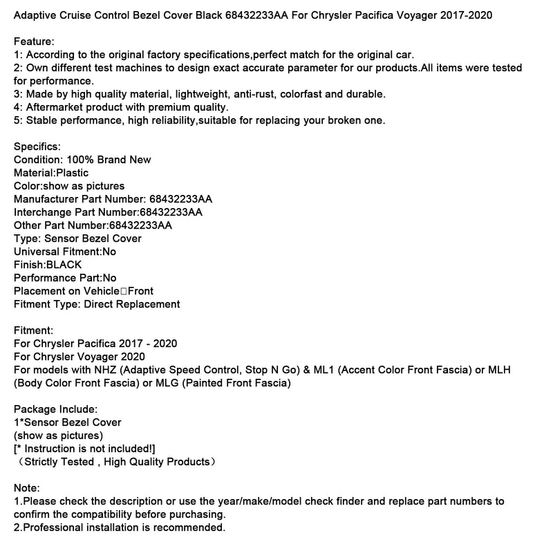 Adaptive Cruise Control Bezel Cover Black 68432233AA For Chrysler Pacifica Voyager 2017-2020