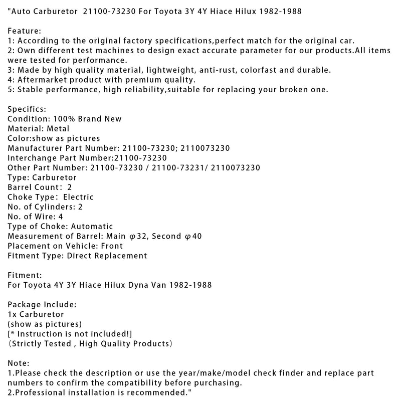 1982-1988 Toyota 4Y 3Y Hiace Hilux Dyna Van Auto Carburetor 21100-73230 21100-73231