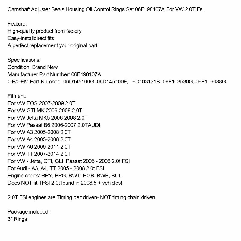 Camshaft Adjuster Seals Housing Oil Control Rings Set 06F198107A For VW 2.0T Fsi