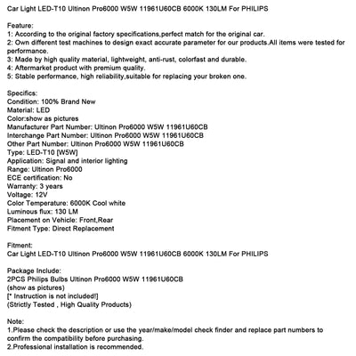 Car Light LED-T10 Ultinon Pro6000 W5W 11961U60CB 6000K 130LM For PHILIPS