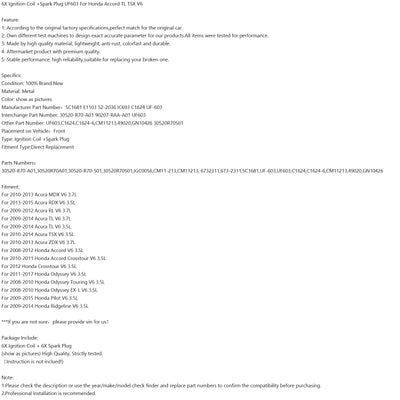 2013-2015 Acura RDX V6 3.5L Ignition Coil +Spark Plug UF603 5C1681 6Pcs