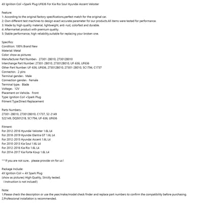 4X Ignition Coil +Spark Plug UF636 Fit For Kia Rio Soul Hyundai Accent Veloster