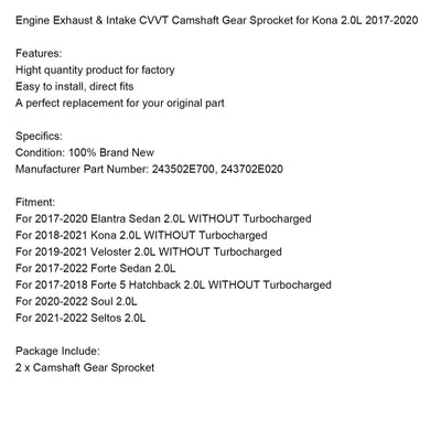 2020-2022 Soul 2.0L Engine Exhaust & Intake CVVT Camshaft Gear Sprocket 243502E700