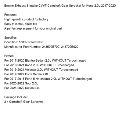 2018-2021 Kona 2.0L WITHOUT Turbocharged Engine Exhaust & Intake CVVT Camshaft Gear Sprocket 243502E700