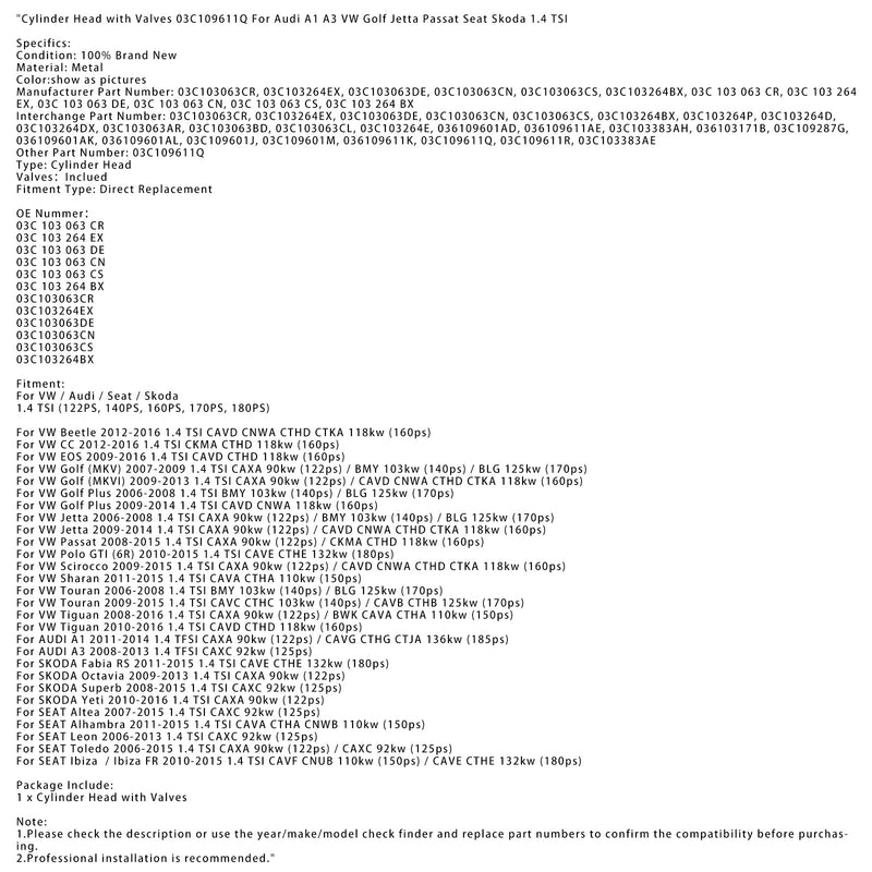 Cylinder Head with Valves 03C109611Q For Audi A1 A3 VW ForGolf Jetta Passat?Seat Skoda 1.4 TSI