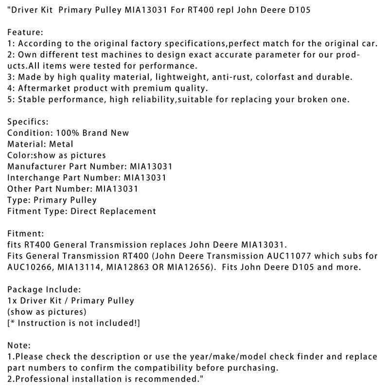 Driver Kit Primary Pulley MIA13031 For RT400 repl John Deere D105