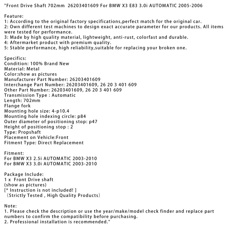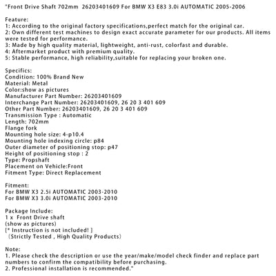 Front Drive Shaft 702mm 26203401609 For BMW X3 E83 3.0i AUTOMATIC 2005-2006