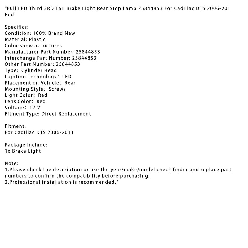 2006-2011 Cadillac DTS Full LED Third 3RD Tail Brake Light Rear Stop Lamp Red 25844853