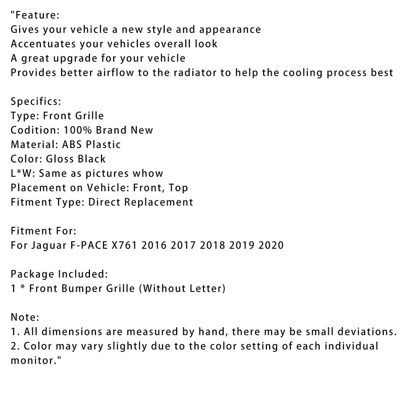 2016-2020 JAGUAR F-PACE X761 Gloss Black Front Bumper Grill Grille