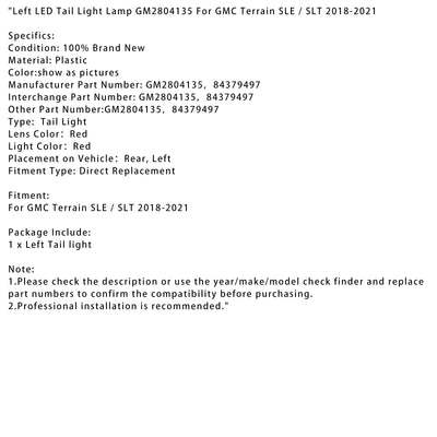 Left LED Tail Light Lamp GM2804135 For GMC Terrain SLE / SLT 2018-2021