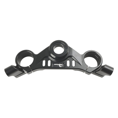 Top yoke Triple clamps are cut from solid aluminum billet, which is more stable and reliable than die-casting process, and more beautiful in appearance. Anodized to ensure no fading for a long time. Following the GP style, the symmetrical hollow design is lighter and stronger, making it more combat-oriented.