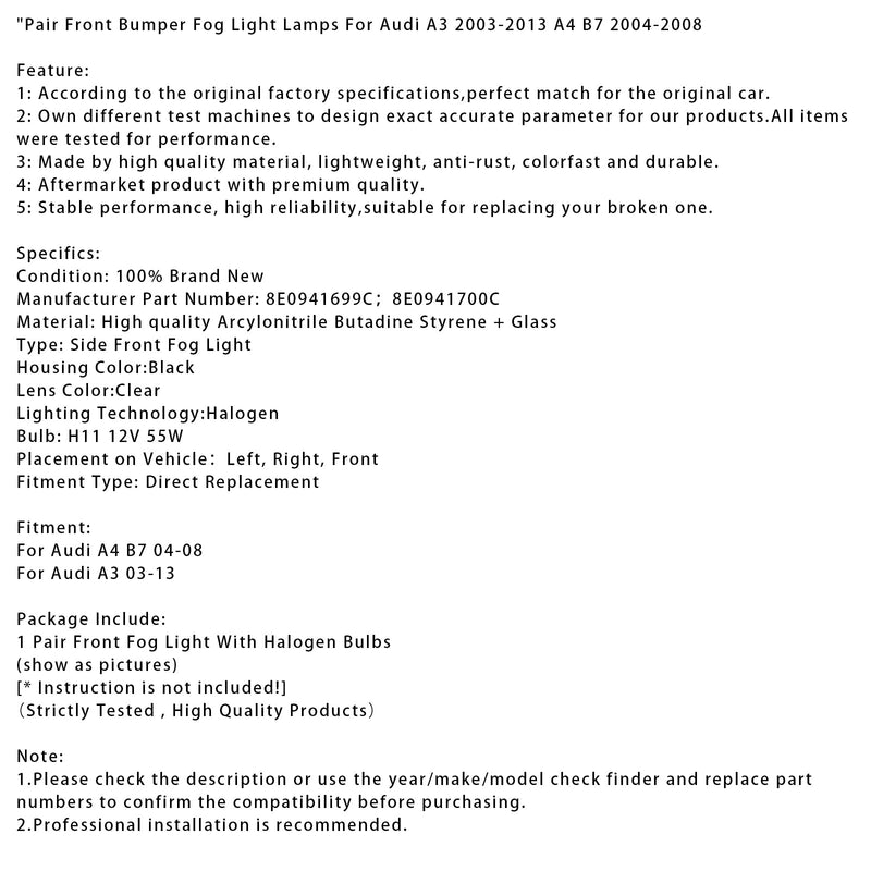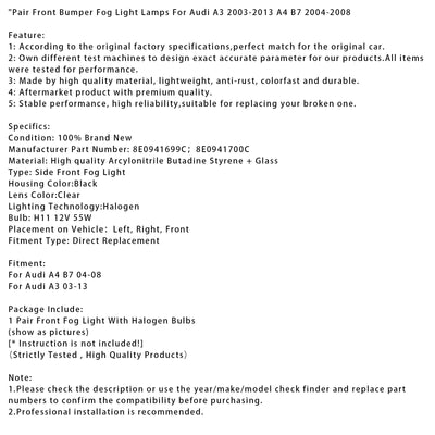 Pair Front Bumper Fog Light Lamps For Audi A3 2003-2013 A4 B7 2004-2008