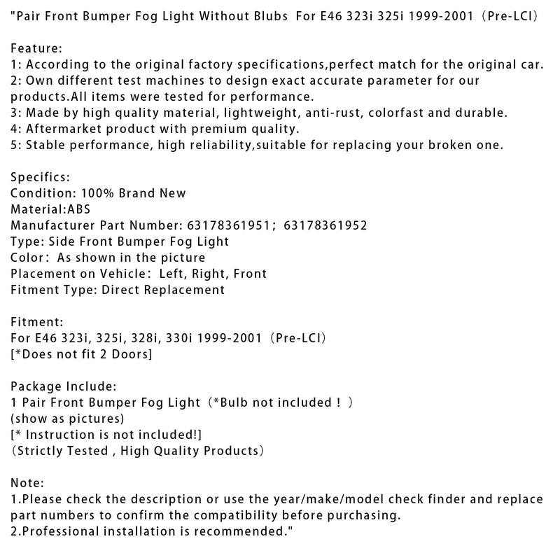 Pair Front Bumper Fog Light Without Blubs ?For E46 323i 325i 1999-2001£¨Pre-LCI£©