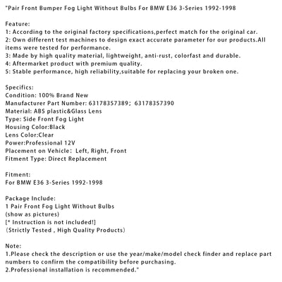 Pair Front Bumper Fog Light Without Bulbs For BMW E36 3-Series 1992-1998