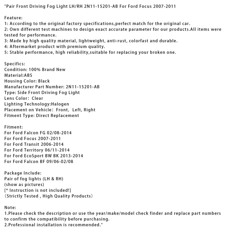 Pair Front Driving Fog Light LH/RH 2N11-15201-AB For Ford Focus 2007-2011