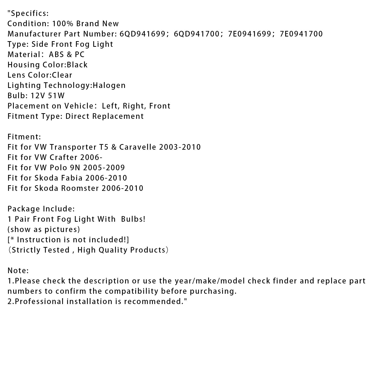 Pair Front Fog Light With Bulbs For VW Transporter T5 & Caravelle 2003-2010