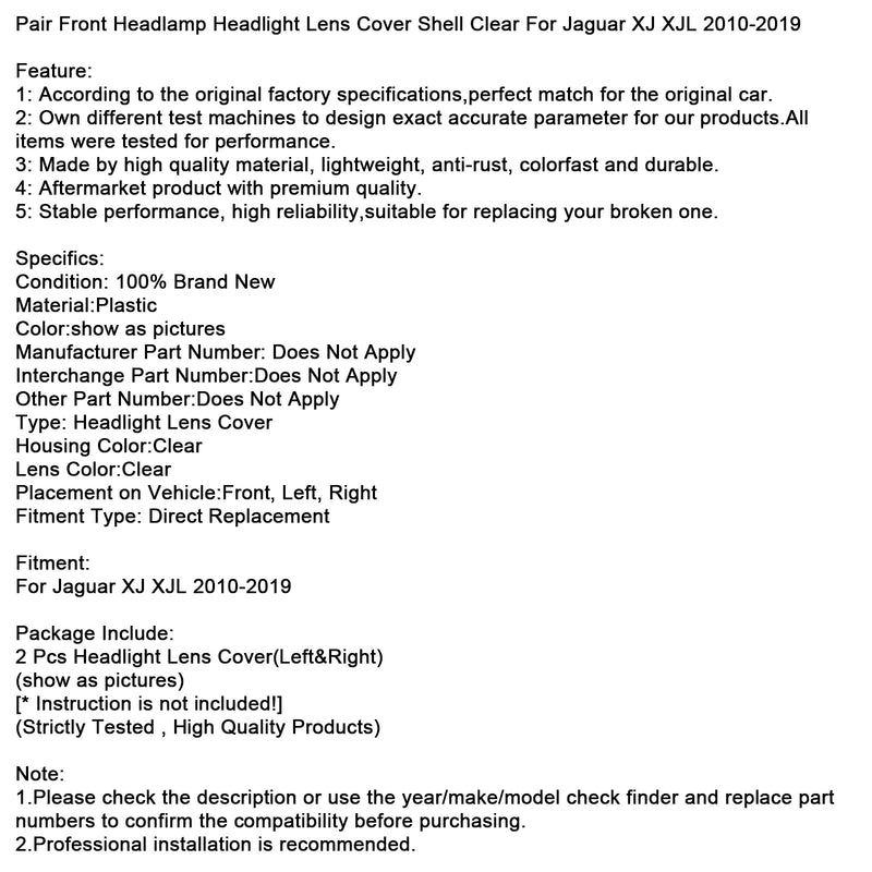 Pair Front Headlamp Headlight Lens Cover Shell Clear For Jaguar XJ XJL 2010-2019