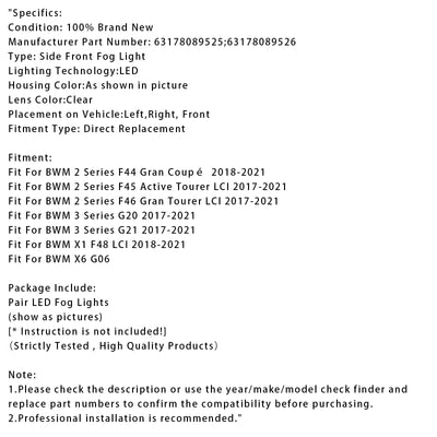 Pair LED Front Bumper Fog Lights For BMW G20 G21 X1 F48 LCI F45 F46 63178089526
