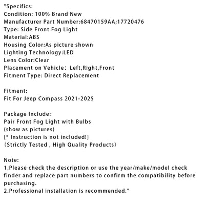 Pair LED Front Driving Fog Light For Jeep Compass 2021-2025 68470159AA