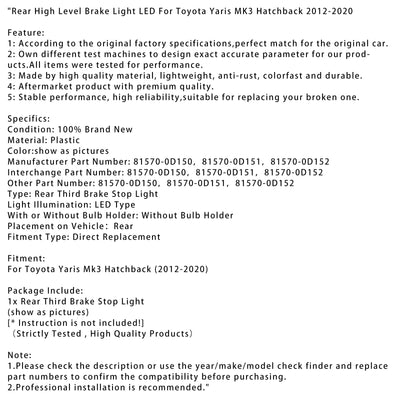 Rear High Level Brake Light LED For Toyota Yaris MK3 Hatchback 2012-2020