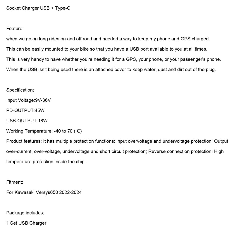 2022-2024 Kawasaki Versys 650 Right Socket Charger USB + Type-C Quick