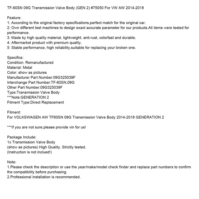 TF-60SN 09G Transmission Valve Body (GEN 2) #75050 For VW AW 2014-2018